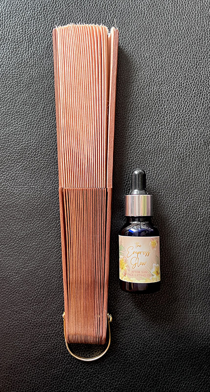 Deze set bestaat uit een handgemaakte waaier en een flesje after sun olie