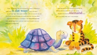 Tijger-Tijger heeft een rotdag. Zijn ouders maken ruzie, op school wordt hij met sport als laatste gekozen en zijn beste vriend speelt met iemand anders. Gelukkig ontmoet hij Schildpad die hem vraagt waarom hij zo verdrietig is. Schildpad stelt hem vier vragen die alles veranderen. Tijger-Tijger leert van hem dat gedachten heel belangrijk zijn en dat hij zelf kan controleren of zijn nare gedachten waar zijn of niet door ze om te keren. Hierna blijkt dat de meeste nare gedachten niet waar zijn. Zo ontdekt hij dat zijn problemen niet door dingen worden veroorzaakt, maar door zijn gedachten. Deze ontdekking zorgt ervoor dat Tijger-Tijger nare gedachten gemakkelijker los kan laten en weer blij door het leven gaat. Dit prentenboek heeft illustraties (aquarel en pen) in heldere kleuren, die zijn verdeeld over twee bladzijden. De tekst varieert van vier tot negen regels. Het is gebaseerd op 'The Work' en de bestseller 'Vier vragen die je leven veranderen' (2009) van dezelfde auteur. Beide zijn gericht op volwassenen. Het is gelukt om de boodschap in een voor kinderen begrijpelijke en door de vrolijke illustraties aantrekkelijke vorm te gieten. Voor kinderen van ca. 4 t/m 8 jaar.